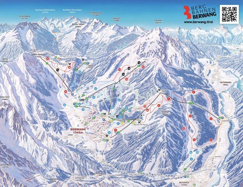 Berwang is part of the Zugspitz Arena (900‑2,700 m), with the well‑known villages Lermoos, Ehrwald, Biberwier, Bichlbach, Namlos and Rinnen. Winter sports enthusiasts can choose from six separate ski areas, each with its own character – together a total of 143 km of pistes. With a Top Snow Card it is possible to ski in all these villages, as well as on the glacier of the Zugspitze and across the border in the German villages Garmisch‑Partenkirchen, Mittenwald and Grainau.